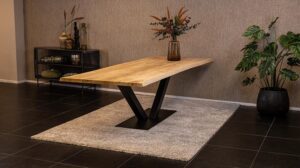 Het zwart gepoederde stalen V onderstel is een centraal onderstel en geeft daardoor heel veel ruimte voor het plaatsen van je stoelen of de eetbank. Met dit onderstel kun je de volledige lengte van je tafel gebruiken. De vorm is uniek en geeft een moderen twist aan de tafel. Ga je voor een lengte van meer dan 240cm dan krijg je dit onderstel met een dubbele V.
